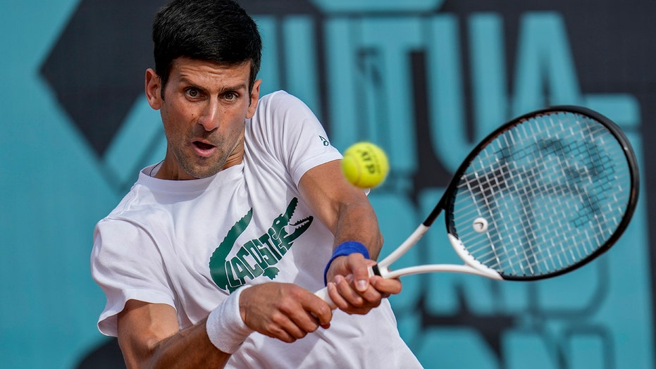Novak Djokovic returns the ball during a training session at the Mutua Madrid Open in Spain, April 30, 2022. (AP Photo/Manu Fernandez)